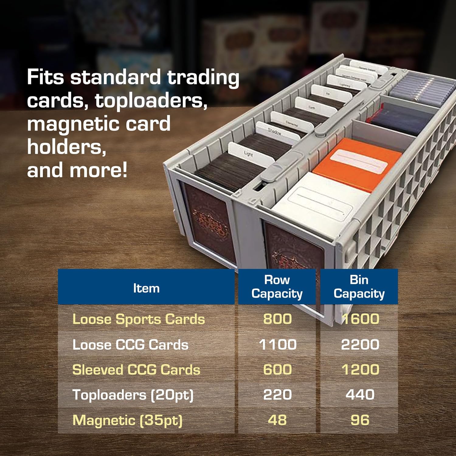 - Durable Design: This card storage box is constructed with high-quality materials, has wide rows strategically designed to store toploaders, magnetics, and deck boxes, and includes 2 partitions to help you customize and organize your collection.
